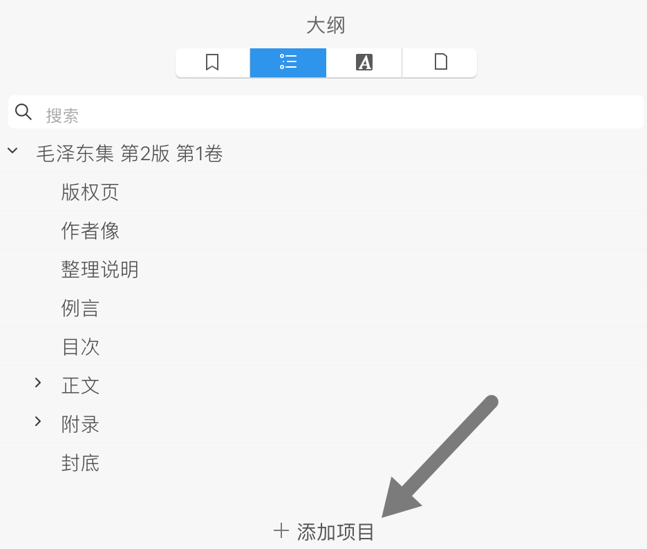 PDF Expert 支持编辑文档大纲,通过拖动目录来调整顺序和层级。如果原文档没有目录,你也可以点击「大纲」底部的「添加项目」按钮,自行添加目录。