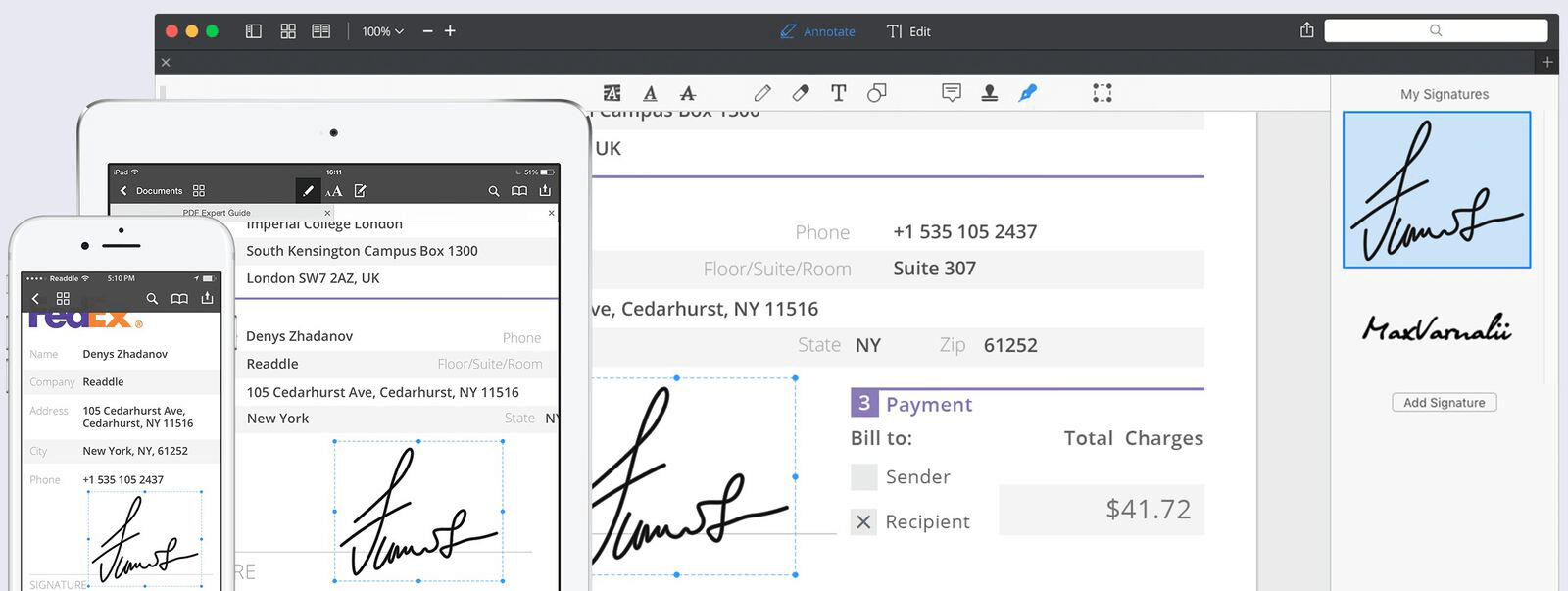 此外,PDF Expert 还支持签名功能。通过触控板来手写或者用键盘输入名字,软件会自动转换成手写样式。而且签名会同步到所有设备上,方便签署合同时使用。