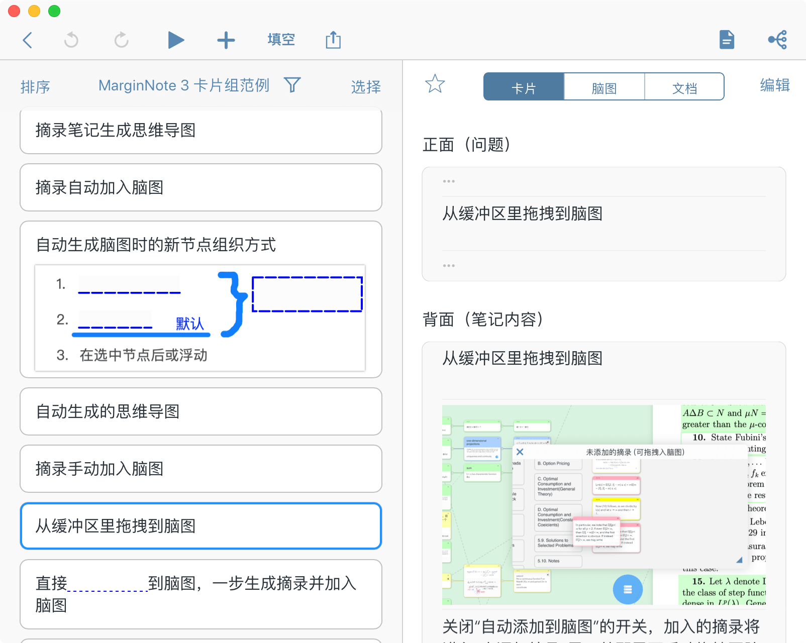 通过 MarginNote,你可以在文档中以文字、语音、图片等形式插入笔记,这些笔记都可以变成一张张「知识卡片」。