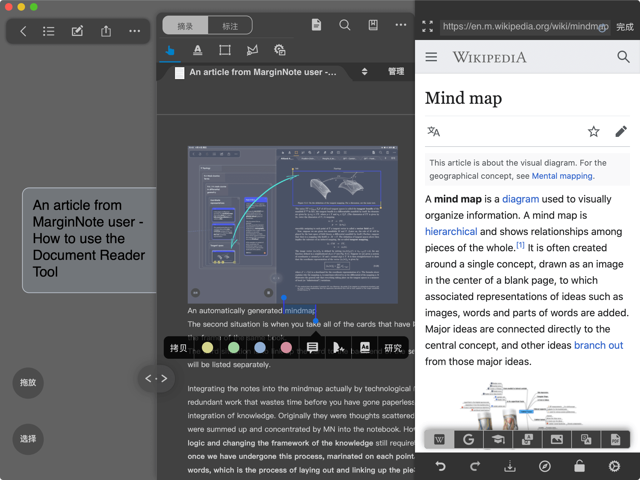 MarginNote 可以读取摘录内容从而自动创建脑图,方便知识的归纳与梳理,轻松理清学习思路。将 PDF、图片、文本拖到脑图中,多个文档链接在同一脑图中,学习资料相互串联更高效!