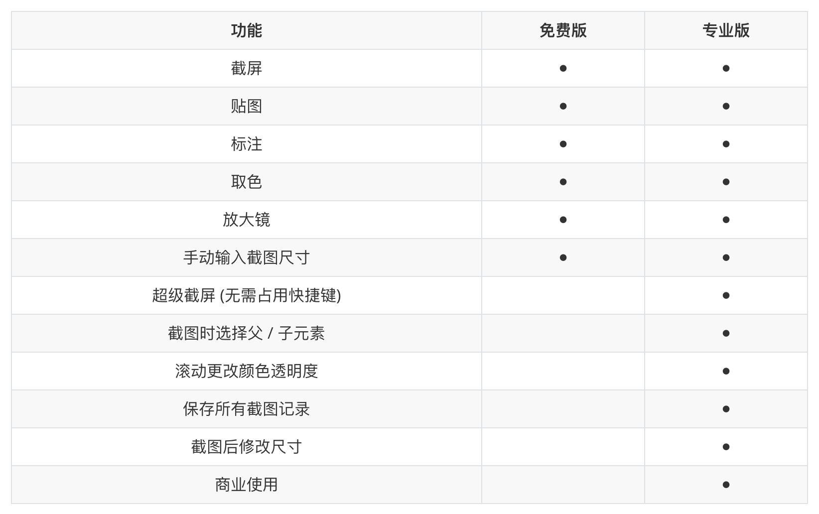 另外从 2.0 开始,Snipaste 免费版将只提供缺陷修复,基本不再提供新功能,后续开发的新功能都只加入到专业版。