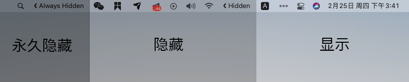 Bartender 4 采用了「三段式」的分类方式,从左到右依次是:永久隐藏 > 隐藏 > 显示。