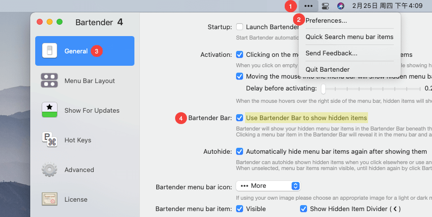 默认并不会启用,需要在菜单栏右键依次点击「··· > Preferences…」选项,在新界面中找到「General > Bartender Bar」选项,勾选之后就可以使用了。