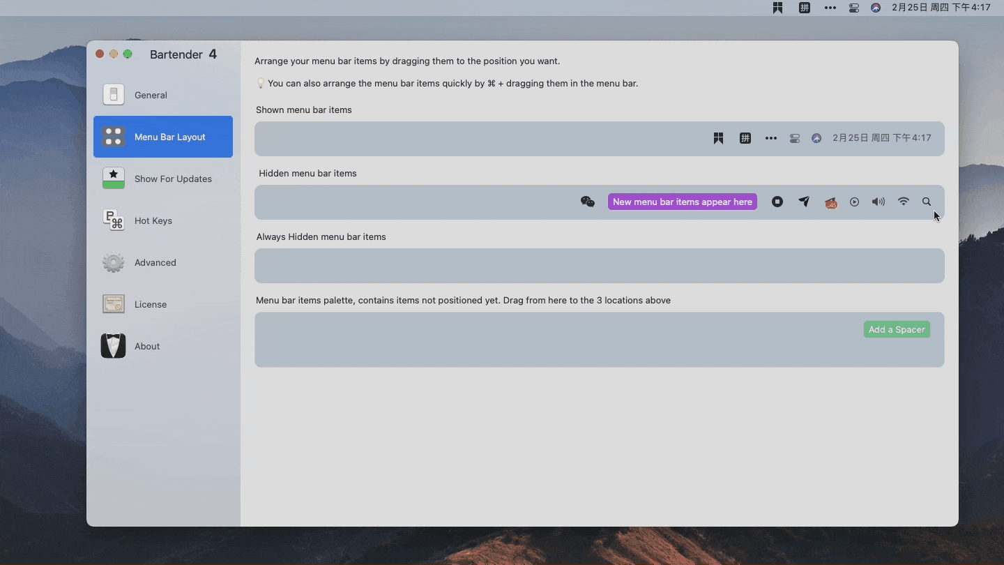 当然 Bartender 4 延续了旧版的使用习惯,按住 ⌘Command 直接在菜单栏拖拽管理。