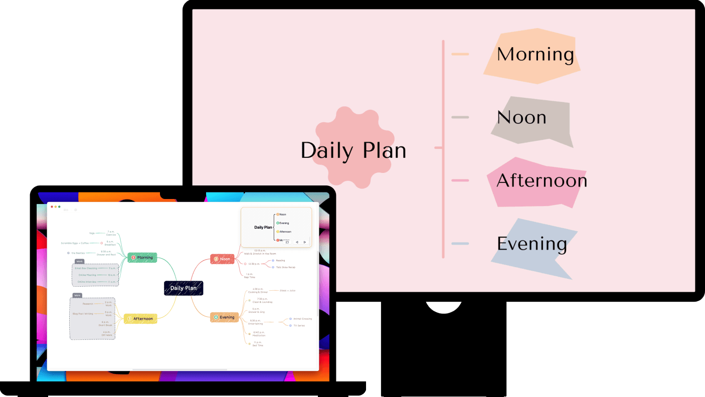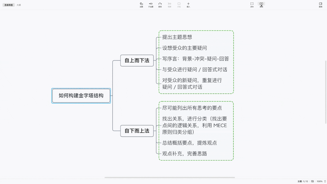 演说模式为思维导图增加了演示展示功能,自动生成优雅的版式和转场动画,让你像幻灯片一样演示思维导图。