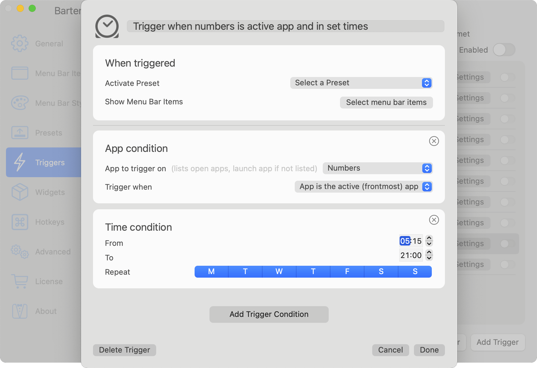 旧版本的 Bartender,就可以在软件有通知等变化时,自动显示图标进行提醒。现在新的触发功能更加好用,可以设定在充电、连接特定 WiFi、特定时间 / 位置时,显示 / 隐藏项目,或开启某个预设场景。
