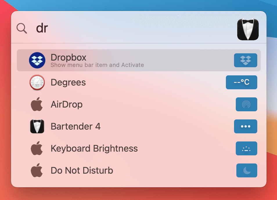 Bartender Bar 则是在菜单栏下方单独成行,收纳隐藏的图标。对于刘海屏 MacBook,就有更多空间来放置需要的项目。