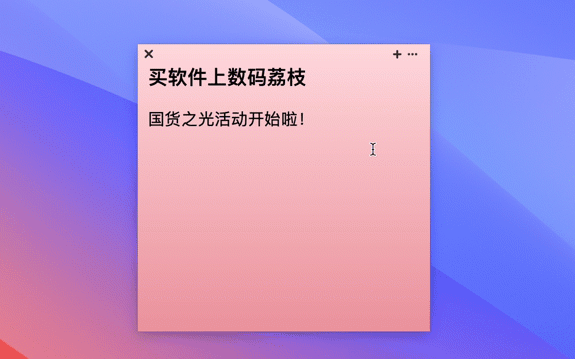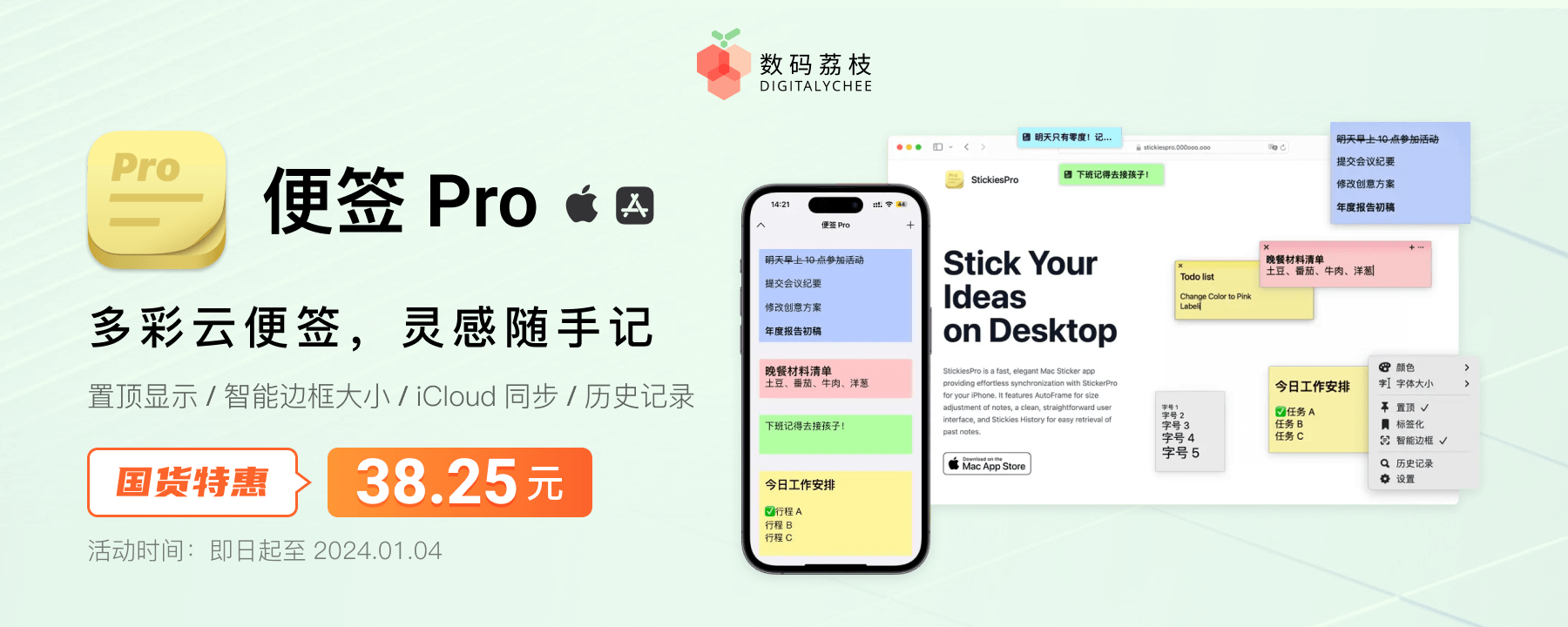 赶紧来了解一下 Mac 多彩思维速记工具便签 Pro!拥有智能边框大小、iCloud 同步、历史记录、置顶显示、标签化等功能。现在国货之光活动限时 8.5 折优惠进行中,买断仅需 38.25 元。
