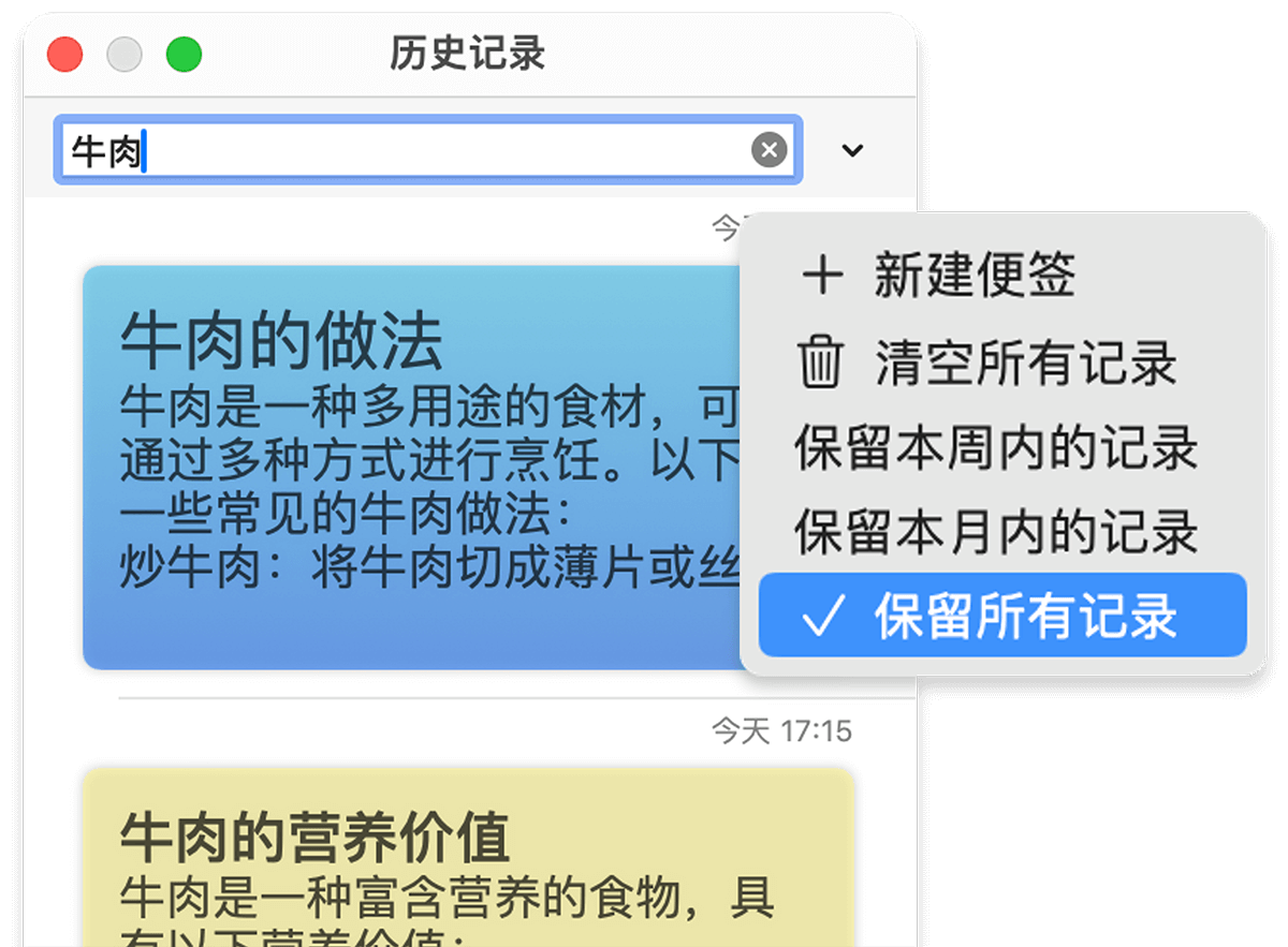 当我们关闭便签后,回头想要查看 / 恢复,只需要进入历史记录中心,通过浏览 / 搜索就能找回来,双击还能恢复该便签。
