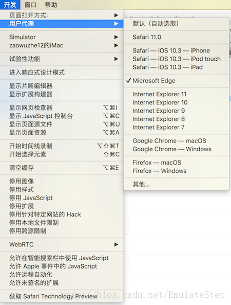 Safari开发选项 -> 用户代理 -> Microsoft Edge,如下图所示: